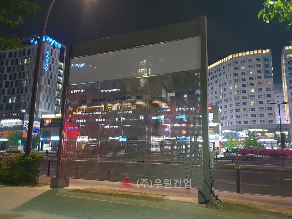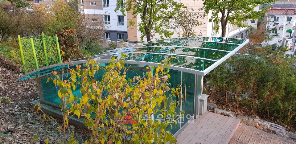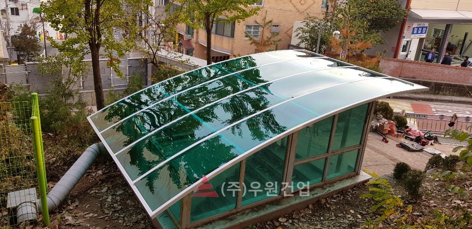 기존의 전시관 출입구 철제 부분에 녹이 생기고 폴리카보네이트가 파손되어 있는 부분이 있었습니다. 보수 공사를 통해 완공이 되었을 때에는 반짝반짝하고 철제 부분도 견고하고 튼튼하게 구성이 되었습니다.