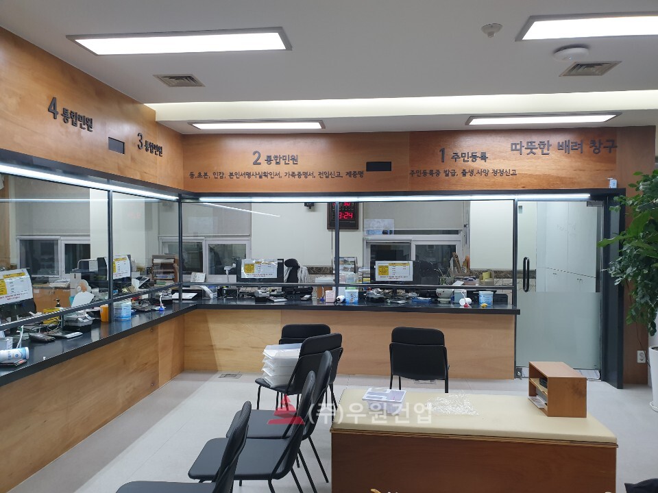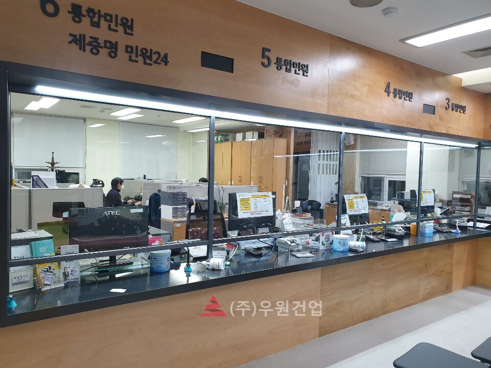 주민센터 청사 내부 코로나 환경 개선 공사로 민원 행정실 유리 칸막이 및 강화 도어 설치 작업 공사를 진행하였습니다. 안전하게 업무를 볼 수 있는 환경을 갖추도록 공사 시공을 완료하였습니다.